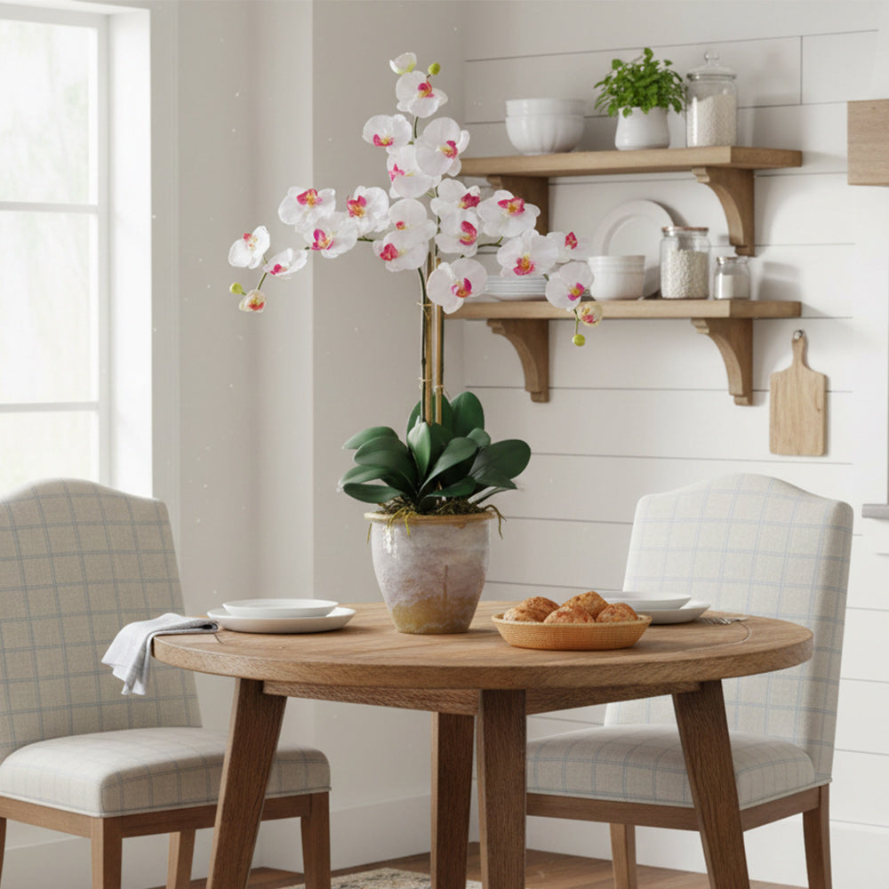 - Product Highlights: With its three stems bursting with white flowers and buds set in a glazed ceramic vase, this artificial phalaenopsis arrangement showcases the structural beauty that makes orchids beloved by so many.
