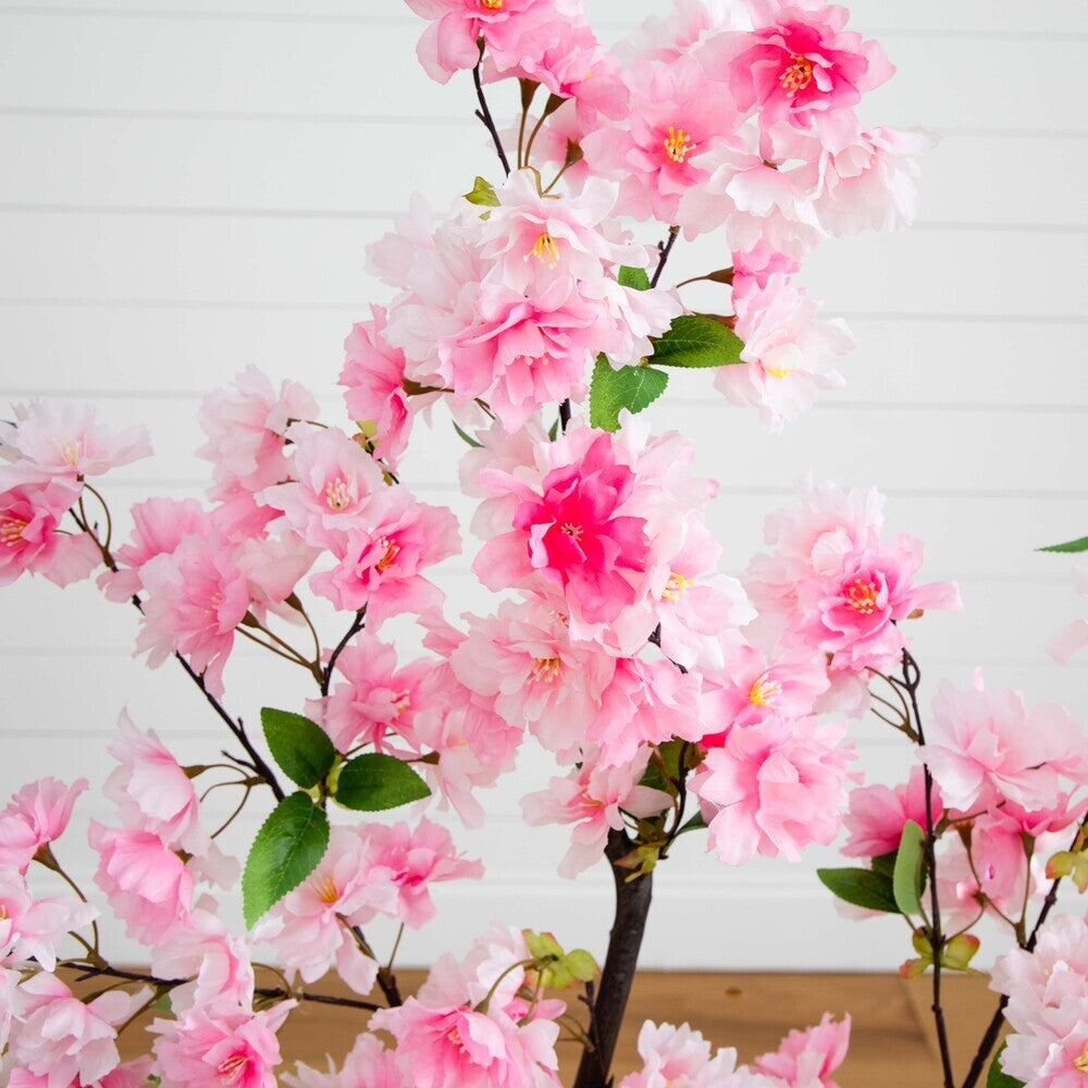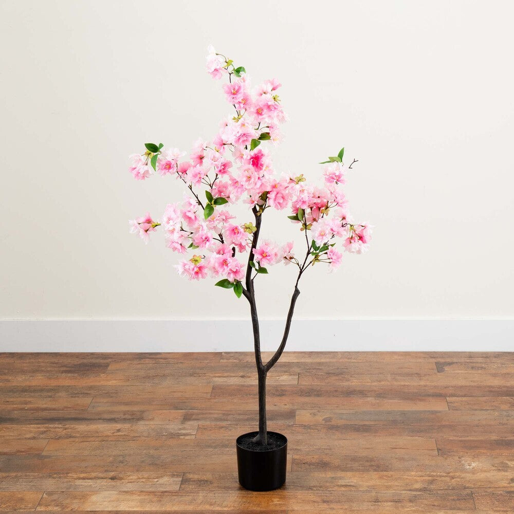 Experience a majestic spring awakening with this artificial pink cherry blossom tree. Feel as though you're walking through a Japanese park admiring the pink blossoms with this tree that features draping branches and delicate green leaves set on a slender, naturally detailed trunk. Standing 4’ tall from a non-decorative nursery pot, this tree adds a pop of soft color to living rooms, bedrooms, and offices.