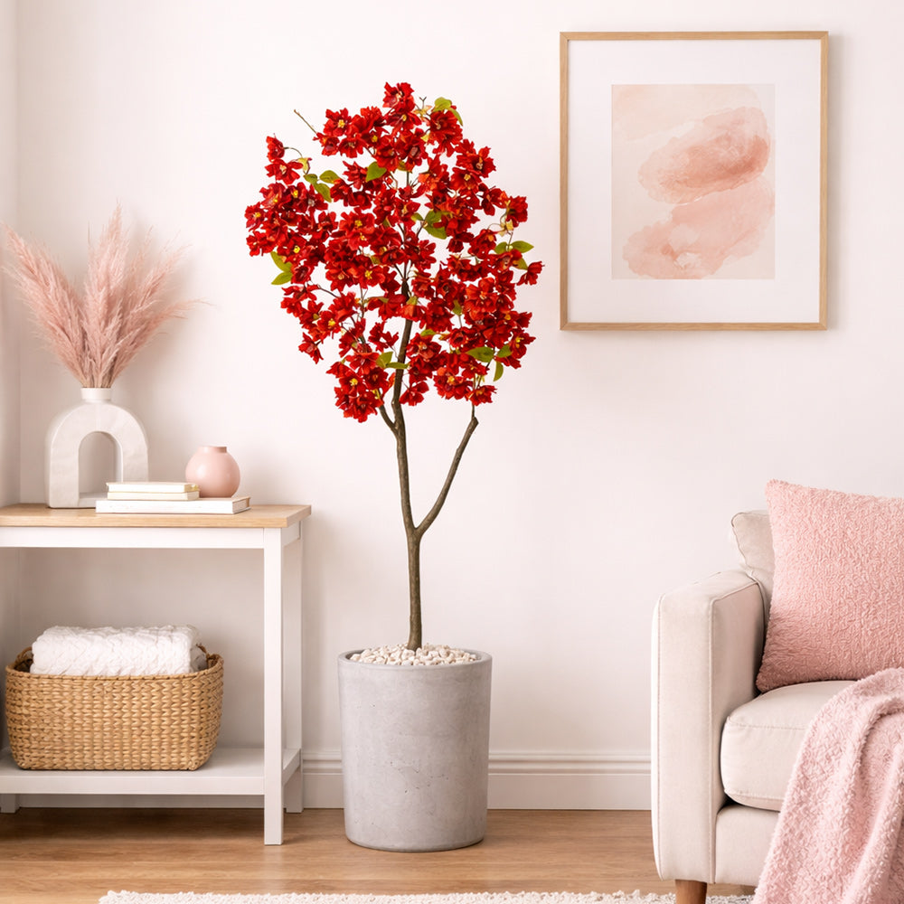 Enjoy the wonders of a majestic spring awakening with this artificial cherry blossom tree. Incredibly lifelike red cherry blossoms bloom atop a slim, brown trunk in a rhythmic melody of foliage with a full look that instantly transforms your home. The vibrant red flowers are accented by green leaves for a contrast that demands attention. At 4’ tall inside a nursery pot, this cherry blossom is perfect for bedrooms, bathrooms, awkward corners, or kitchen nooks.