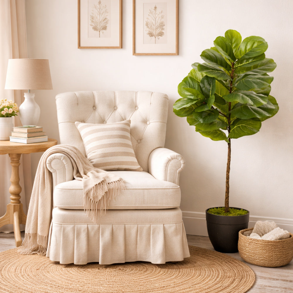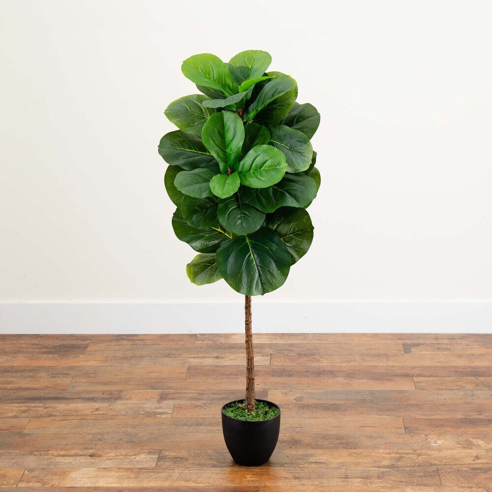 Showcase year-round greenery throughout your home or office with this artificial fiddle leaf tree boasting thick layered Real Touch leaves sprouting atop a skinny but detailed trunk. Standing 46” high from an accompanying nursery planter, this fake tree can easily brighten any space it inhabits.