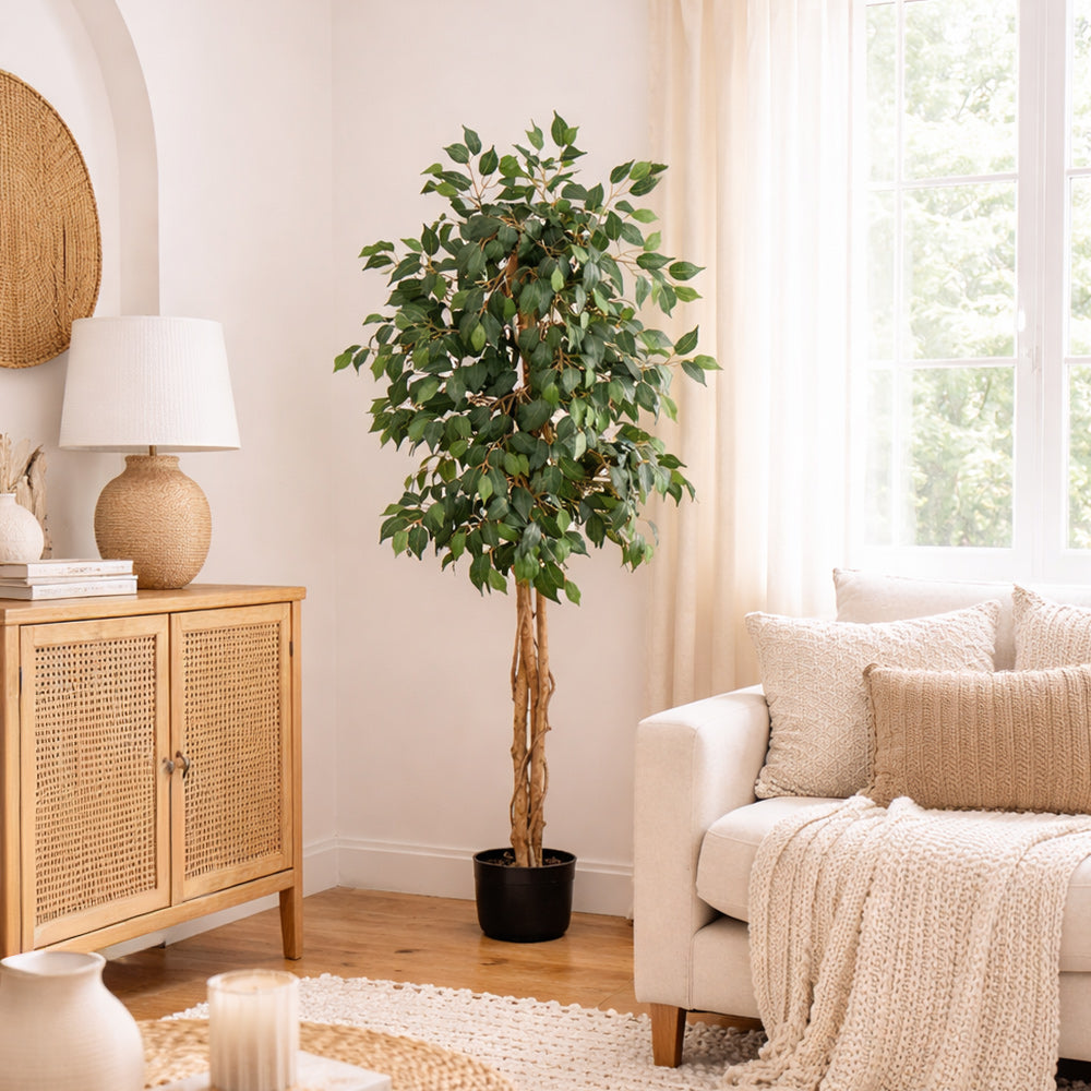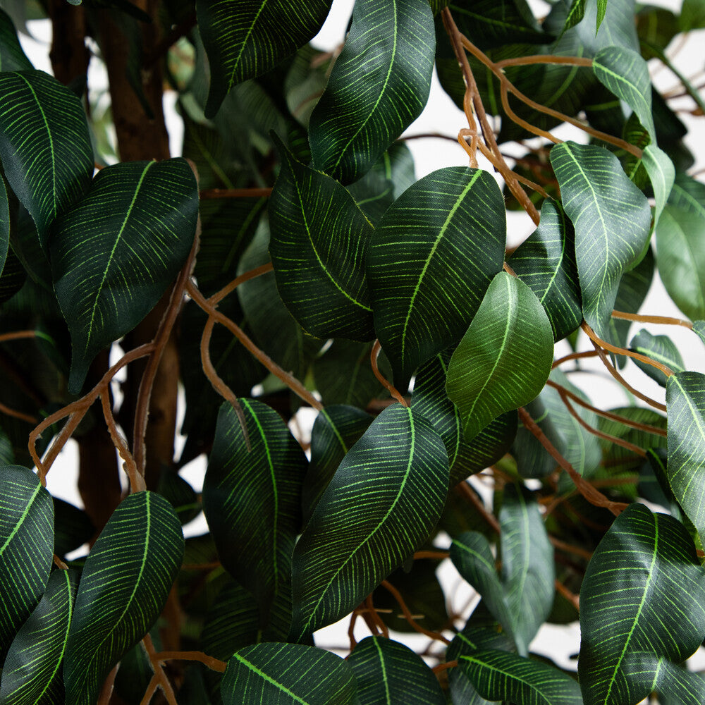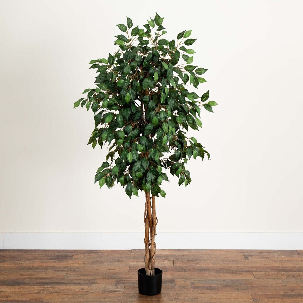 - Product Highlights: With 756 lifelike leaves crowning intertwining trunks, this artificial Ficus tree makes a bold, lasting statement in any room.