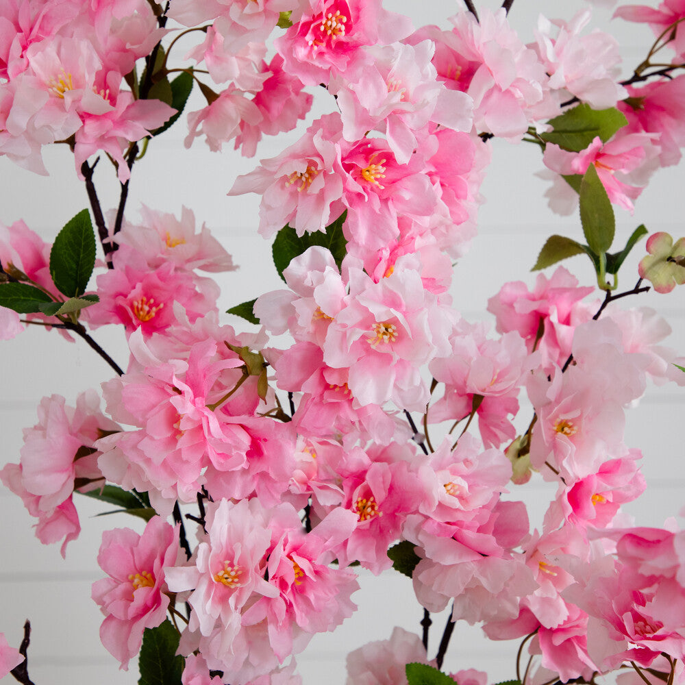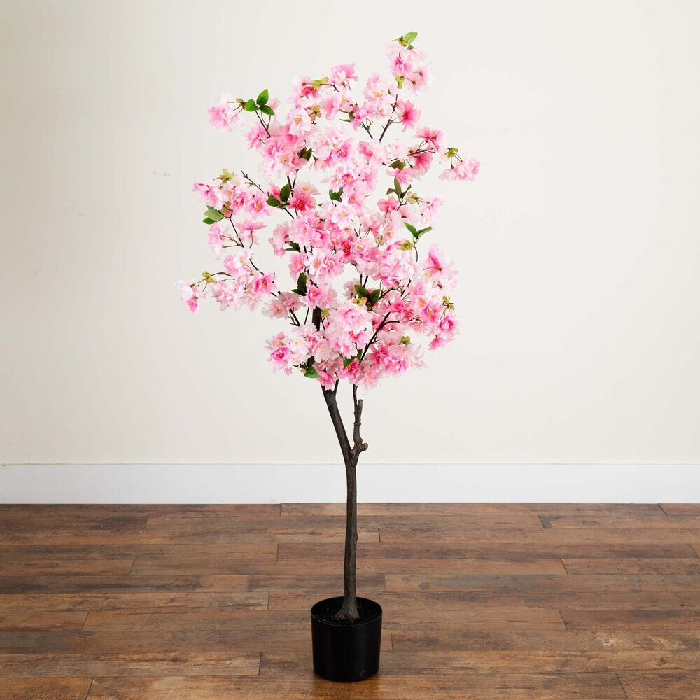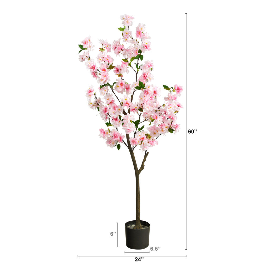 Enjoy the wonders of a majestic spring awakening with this artificial cherry blossom tree. Incredibly lifelike pink cherry blossom flowers adorn a slim, brown trunk in a rhythmic melody of pink foliage for a full look that will instantly bring the feel of stroll through a Japanese park. The pink flowers feature shades of white accented by green leaves for a feminine touch that softens spaces. Standing 5’ tall from a non-decorative nursery pot, this tree is perfect for bedrooms, bathrooms, awkward corners, or kitchen nooks.