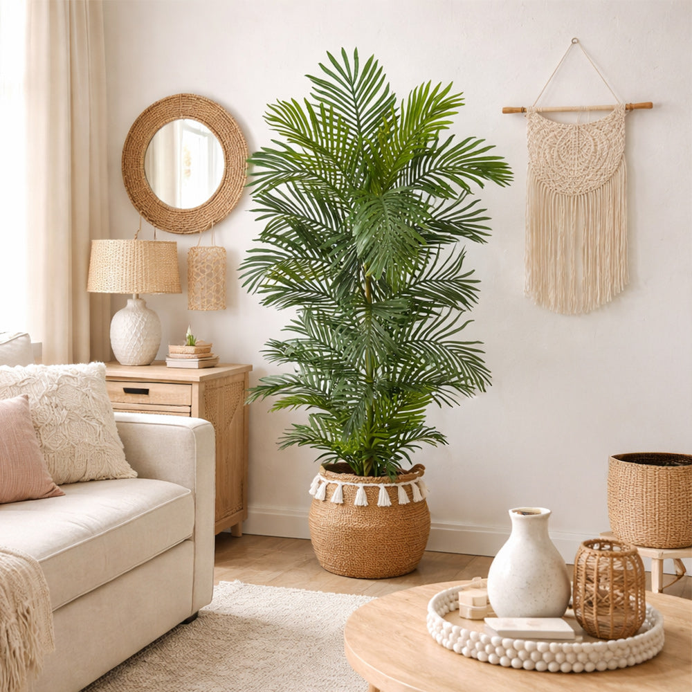 Kick back, relax, and stay in vacation mode year-round with this artificial areca palm tree. Its long, variegated palm fronds arch in a variety of directions, bringing symmetry and depth to any room. Add this faux palm tree outside, and watch the fronds move with the wind just like live ones. You can even bend them to fit in your space and desired style. Standing 5’ tall from a boho chic planter (included in height), add to any indoor or outdoor space. Great for a patio, next to outdoor furniture, or in the foyer.