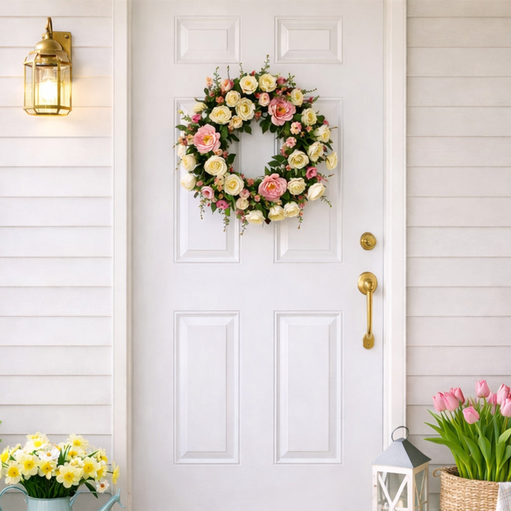 What better way to greet guests than with a white and pink artificial rose wreath? This romantic wreath showcases lifelike roses in a palette of pastel hues nestled between contrasting rich green leaves. Its 20” diameter makes it perfect for any location, from a bare corner to a door or lonely wall.